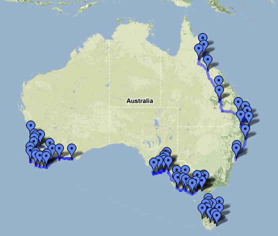 Victoria, Zuid AustraliëReis van Melbourne naar Adelaide; door westelijk Victoria en het zuidwesten van Zuid Australië (incl. Kangaroo Island). Victoria, Australian Capital Territory, New South Wales (niet op het kaartje aangegeven) Reis van Melbourne door het "hoogland" naar Canberra en langs de kust terug naar Melbourne. Tasmanië, Victoria "Rondje" Tasmanië en korte reis door gebied ten oosten van Melbourne. Queensland, New South Wales Reis van Cairns, via Brisbane naar Sydney; door oostelijk deel van beide staten en in New South Wales voornamelijk door kustgebied. West Australië "Rondje" Perth; door het zuidwestelijk deel van West Australië waarbij Esperance het meest oostelijke punt is en Nambung NP het meeste noordelijke. |