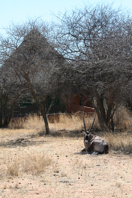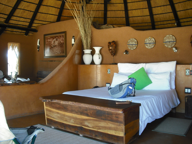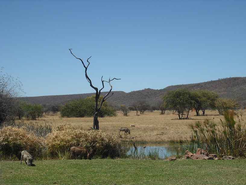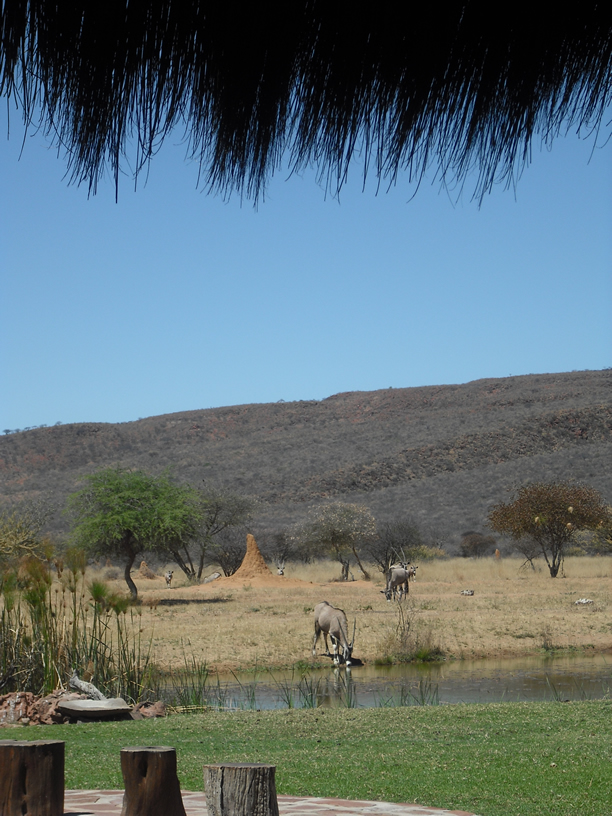 Baboons” betekent. Deze fantastische plek is gerelateerd aan de AfriCat Foundation en is een echte aanrader. De lodge heeft verschillende types accommodatie. Wij verbleven in een van de 8 huisjes (met rieten dak) in het Luxury Bush Camp. Rond het huisje waren héél veel verschillende vogels te bewonderen. In het hoofdgebouw van deze accommodatie is de bar en het restaurant gevestigd. Het geheel is zeer sfeervol, men is zeer gastvrij en het eten is heel prima. Het is mogelijk om aan verschillende activiteiten deel te nemen. Aan het eind van de middag zijn wij meegegaan met de game drive op zoek naar een luipaard en in de ochtend stond de zoektocht in het teken van jachtluipaarden. Onze gids Albert was héél kundig en aardig. Na het avondeten lieten we ons naar de plek brengen waar nachtdieren met etensresten werden gevoerd. Dat doet men om dat men het zonde vindt eten weg te gooien. Het gebeurt in het donker omdat de dieren, zoals bijvoorbeeld stekelvarkens, die daar op af komen verder geen ongewenst gedrag gaan vertonen. Zou overdag voedsel worden aangeboden dan zouden er bijvoorbeeld bavianen op afkomen die zichzelf vervolgens aanleren dat er bij mensen eten te halen is. Als je een dergelijk groep bavianen in de buurt hebt dan moet je echt ramen en deuren hermetisch afsluiten; ze vernielen vanalles om maar bij het eten te komen.
