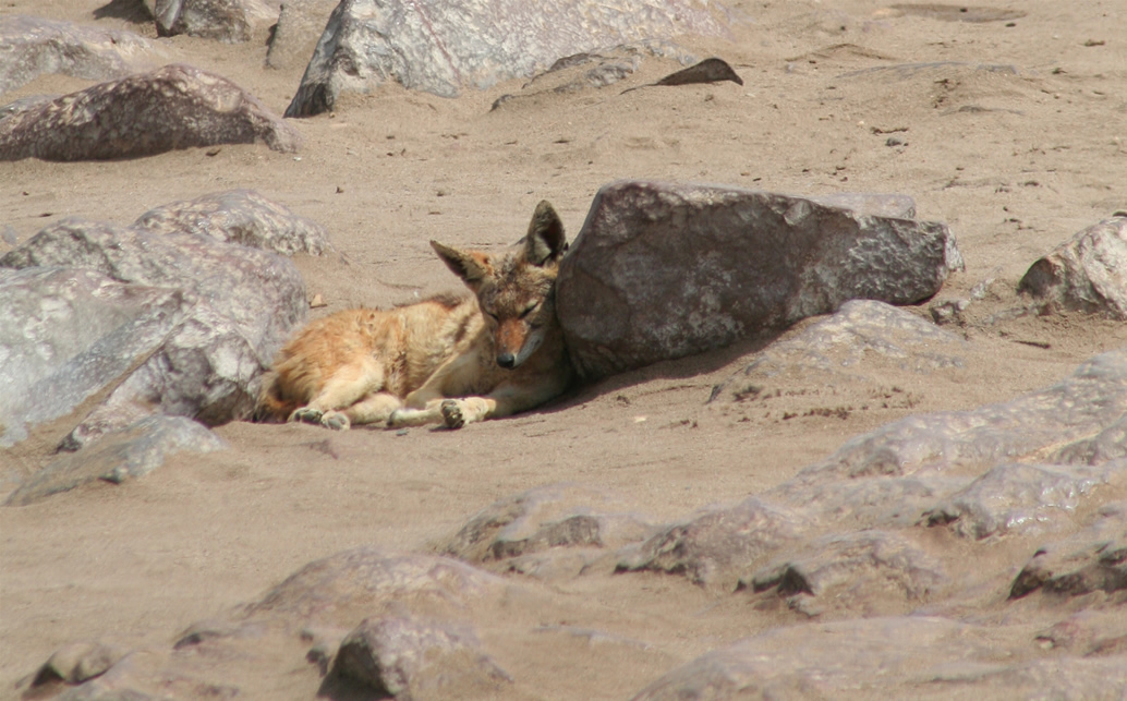 onze reisgidsen zou de stank enorm zijn! Kennelijk stond de wind gunstig toen wij er waren, want we roken niets. In november/december zijn er jongen in de kolonie. Het geluid dat deze jongen maken lijkt sterk op het geblaat van lammetjes. Hun aanwezigheid trekt jakhalzen aan en dat veroorzaakt nogal wat onrust. Moederpelsrob wil natuurlijk voorkomen dat een jakhals haar jong te pakken krijgt, dus je ziet vaak dat een jong door moeders bij het nekvel wordt gegrepen. Het is echter onvermijdelijk dat je een jakhals er met een jong vandoor ziet gaan of dat een stel jakhalzen om “de buit” vechten. In 1485 kwam hier de Portugees Diego Cao aan land. Er was toen nog nooit een Europeaan zo ver langs de kust van Afrika gevaren. Hij zette om die reden een kruis op deze plek dat later naar Berlijn is meegenomen door het Oceanographical Museum. De kruizen die er nu staan zijn replica’s. Rond 1900 was er blijkbaar een klein dorp bij Cape Cross. De bevolking leefde van het verzamelen van guano; een afzetting van uitgedroogde uitwerpselen van dieren met een hoge concentratie aan meststoffen. De guano-industrie was in die tijd zeer welvarend maar is uiteindelijk o.a. door de ontwikkeling van kunstmest in verval geraakt.