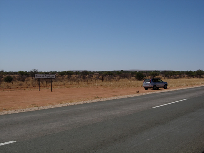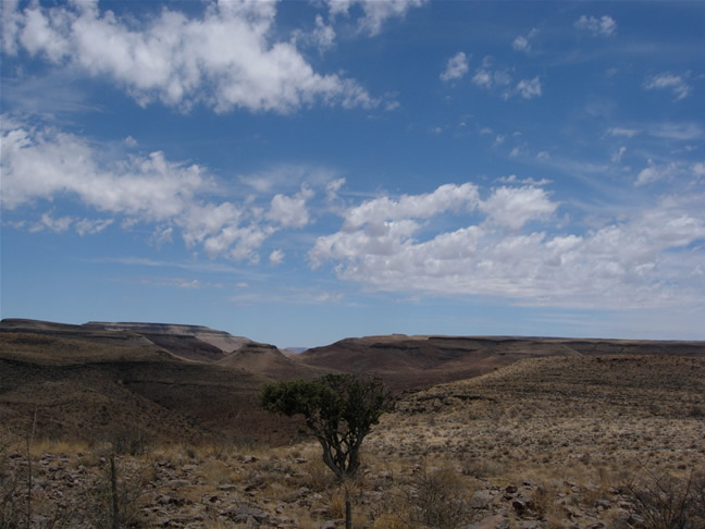 Via de B1 naar Hardap, daar via de C20 naar Stampriet en dan via de C15 naar Gochas. - Fotomoment: Steenbokkeerkring ongeveer 10 km ten zuiden van Rehoboth. - Hardap Dam Game Reserve. - Game drive bij Auob Lodge. Auob Lodge in Gochas. dag 3: Gochas - Fish River Canyon Fish River Canyon ligt ongeveer 410 km ten zuidwesten van Gochas. - Vanuit Gochas via de C18 naar de B1 rijden en via de B1 richting Keetmanshoop rijden. - Iets ten noorden van Keetmanshoop de C16 oprijden. - Na een klein stukje C16 via de C17 naar Quiver Tree Forest. ![]()