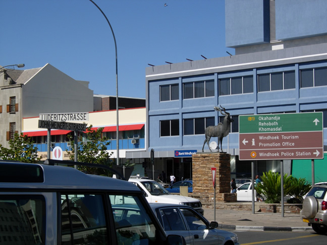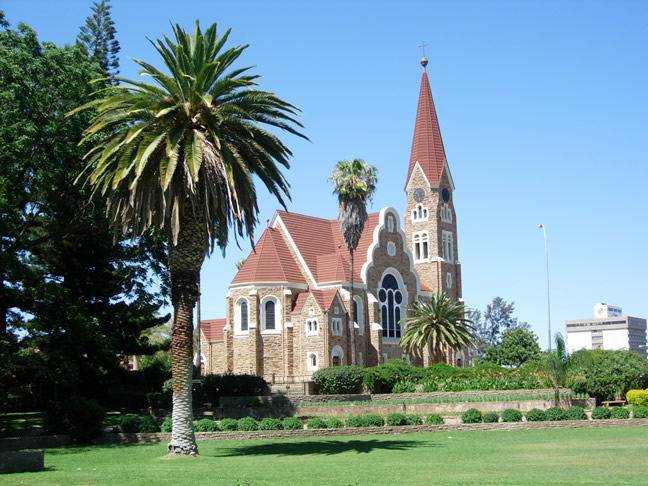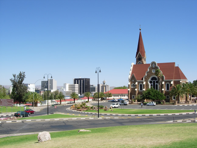 uitstrekt tot de Namib woestijn en de kust. Door de hete waterbronnen (in het huidige Klein Windhoek district) stond Windhoek oorspronkelijk bij de Khoikhoi (Nama) bekend als Ai-gams (stoom, vuurwater) en bij de Herero als Otjomuise (plaats met rook). Deze bronnen zijn eeuwenlang gebruikt door de San en Nama, die met hun dieren door het gebied trokken. Het huidige Windhoek is rond 1840 gesticht door Oorlam leider Jonker Afrikaner. Het verhaal gaat dat hij Wind Hoock heeft vernoemd naar zijn geboortehuis in de Kaap, maar daar is geen feitelijk bewijs voor. In de tijd dat Jonker hier verbleef diende de plaats als handelspost tussen de Oorlam/Nama and Herero. Jonker gebruikte het ook als hoofdkwartier van waaruit hij met zijn commando’s vee stal van de Herero die ten noorden van Swakop River leefden. Na de dood van Jonker in 1861 werd Windhoek verlaten totdat rond 1870 missionaris Schröder zich hier vestigde. Eind 19de eeuw, tijdens de Duitse koloniale bezetting, moest Major Curt von François vrede zien te bewerkstelligen tussen de oorlogvoerende Nama en Herero. In 1890 trokken de Duitsers zich, onder zijn leiding, in Windhoek terug nadat ze door Nama leider Hendrik Witbooi uit Otjimbingwe en Tsaobis waren verdreven. Dit viel samen met de dood van Herero leider Maherero. Tegen de tijd dat zijn opvolger Samuel Herero afgezanten naar Windhoek stuurde, waren de Duitsers al een heel eind gevorderd met het bouwen van het fort, de Alte Feste. Het fort fungeerde als hoofdkwartier van de zogenaamde Schutztruppe. Windhoek groeide, als centrum van de Duitse kolonie, in de jaren hierna rondom het fort verder uit; vooral nadat in 1902 de spoorlijn naar Swakopmund voltooid werd. In die tijd werd er veel gebouwd; onder andere het Tintenpalast, waar nu het parlement zetelt, en de Christuskirche. Het centrum van de stad is te voet goed te bezichtigen; het is immers niet echt groot. In verband met de warmte is het verstandig om ’s ochtends vroeg of aan het eind van de middag te gaan wandelen.