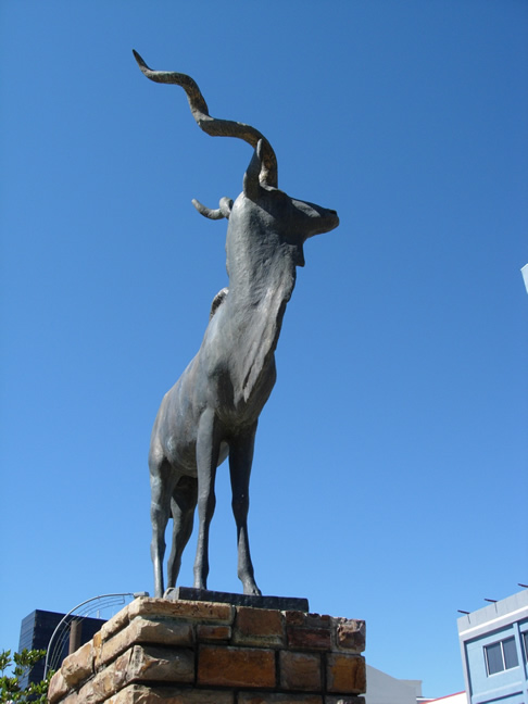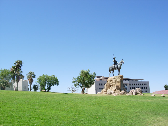 Tussen de Alte Feste en de Christuskirche staat een enorm beeld van een man ter paard. Dit Reder Denkmal (ook wel Rider Memorial of Equestrian Memorial genoemd) is een van de vele oorlogsmonumenten van Windhoek. De ruiter moet General von Trotha voorstellen; de Duitse bevelhebber die aan het begin van de 20ste eeuw gruwelijk geweld gebruikte tegen de Herero- en Namabevolking. Independence Avenue is vanaf de Christuskirche via Fidel Castro Street (waar souveniers in grote hoeveelheden worden aangeboden) te bereiken. Zoo Park ligt op de kruising van beide wegen. Op de plek waar in 1962 restanten van o.a. olifanten uit het Stenen Tijdperk zijn gevonden, staat een beeld. De restanten maken inmiddels deel uit van het State Museum’s Research Collection. Iets noordelijker aan Independence Avenue staat de Clock tower (op de hoek met Post Street). Deze klokkentoren is gemodelleerd naar die van het (reeds verdwenen) gebouw van de Deutsch-Afrika Bank. Nog iets verder noordelijk (op de kruising met Lüderitz Street) staat het Kudu Memorial. Dit beeld is door een rijke zakenman geschonken ter herdenking van de runderpest in 1896 waarbij duizenden koedoes, koeien en schapen omkwamen. De Gibeon Meteorites, vernoemd naar het gebied waar ze werden aangetroffen (ten zuiden van Mariental), zouden behoren een meteorietenregen die als een van de grootste ter wereld wordt gezien. Deze zou meer dan 600 miljoen jaren geleden hebben plaatsgevonden verspreid over een gebied groter dan 20.000 km2. De stenen bestaan voornamelijk uit ijzer, kleine hoeveelheden nikkel en kobalt en sporen van andere elementen. Het gemiddelde gewicht van zo’n steen is bijna 350 kilogram. In totaal zijn er 77 stenen gevonden. In het centrum van Windhoek (Post Street) worden 33 van deze stenen getoond. Men claimt dat het de grootste collectie van meteorieten ter wereld is. |