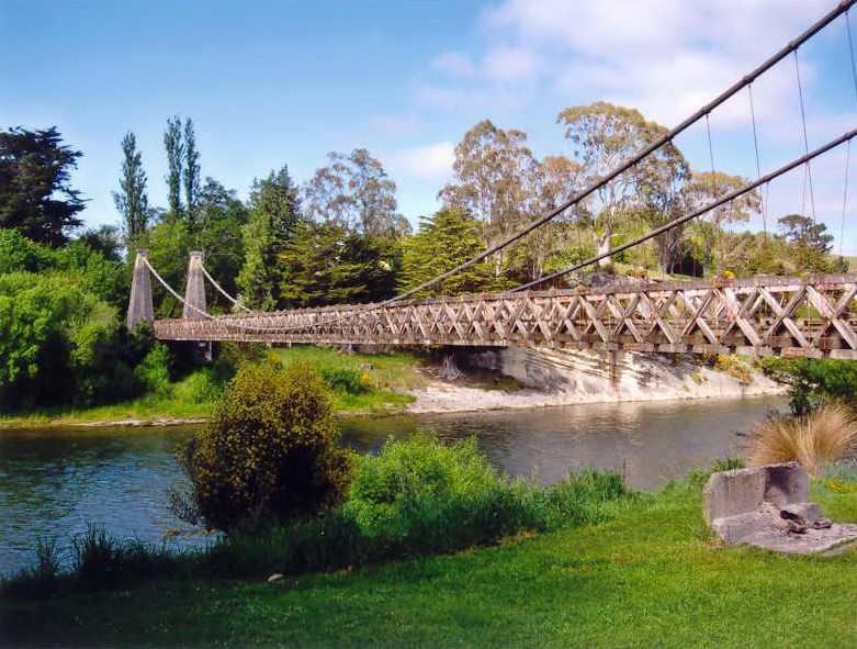 ![]() Ten zuiden van Fiordland NP en ten westen van Invercargill ligt het kleine plaatsje Clifden dat bekend is om de oude hangbrug. Deze brug werd in 1899 over de Waiau River aangelegd en was tot de jaren 70 van de vorige eeuw in gerbuik. De brug bestaat uit 27 stalen kabels bevestigd aan betonnen palen. Het wegdek is van hout. |