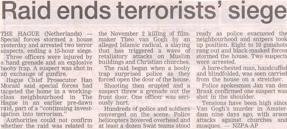 dag 1: Christchurchdag 2: Christchurch - Peel Forest Park dag 3: Peel Forest Park – Lake Tekapo – Lake Pukaki – Twizel dag 4: Twizel – MT Cook NP – Kurow dag 5: Kurow – Portobello (Otago Peninsula) dag 6: Portobello - Otago Peninsula - Waihola dag 7: Waihola - Papatowai dag 8: Papatowai - Tuatapere dag 9: Tautapere - Milford Sound - Te Anau dag 10: Te Anau – Doubtful Sound – Te Anau dag 11: Te Anau – Queenstown – Arrowtown - Wanaka dag 12: Wanaka – Mount Aspiring NP - Haast dag 13: Haast – Fox Glacier, Franz Josef Glacier – Ross dag 14: Ross - Paparoa NP - Cape Foulwind – Carters Beach dag 15: Carters Beach - Kahurangi NP – Carters Beach dag 16: Carters Beach – Lake Rotoroa, Lake Rotoiti (Nelson Lakes NP) dag 17: Lake Rotoiti (Nelson Lakes NP) – Tukurua dag 18: Tukurua - Cape Farewell – Tukurua dag 19: Tukurua – Abel Tasman NP – Motueka dag 20: Motueka – Nelson – Pelorus Bridge SR dag 21: Pelorus Bridge SR – Marlborough Sounds MP – Kaikoura dag 22: Kaikoura – Little River (Banks Peninsula) dag 23: Banks Peninsula dag 24: Banks Peninsula - Arthurs Pass NP - Moana dag 25: Moana - Arthurs Pass NP - Christchurch Klik op de dag voor meer informatie. Tips Bij een lange wachttijd op de aansluitende vlucht is het aan te raden een hotelkamer te reserveren en enkele uren te gaan slapen. Het is ook handig om voor de eerste overnachting een hotel in Christchurch te reserveren i.p.v. direct de camper op te halen en te gaan rijden. Achtergrond De dag van aankomst was de dag van de presidentsverkiezingen in de VS, gewonnen door Bush. Maar het belangrijkste nieuws dat we die dag (eigenlijk ’s nachts) via CNN hoorden, was de moord op Theo van Gogh. Gedurende de hele vakantie hebben we de ontwikkelingen thuis met verbazing gevolgd via internet en soms artikelen in kranten. |