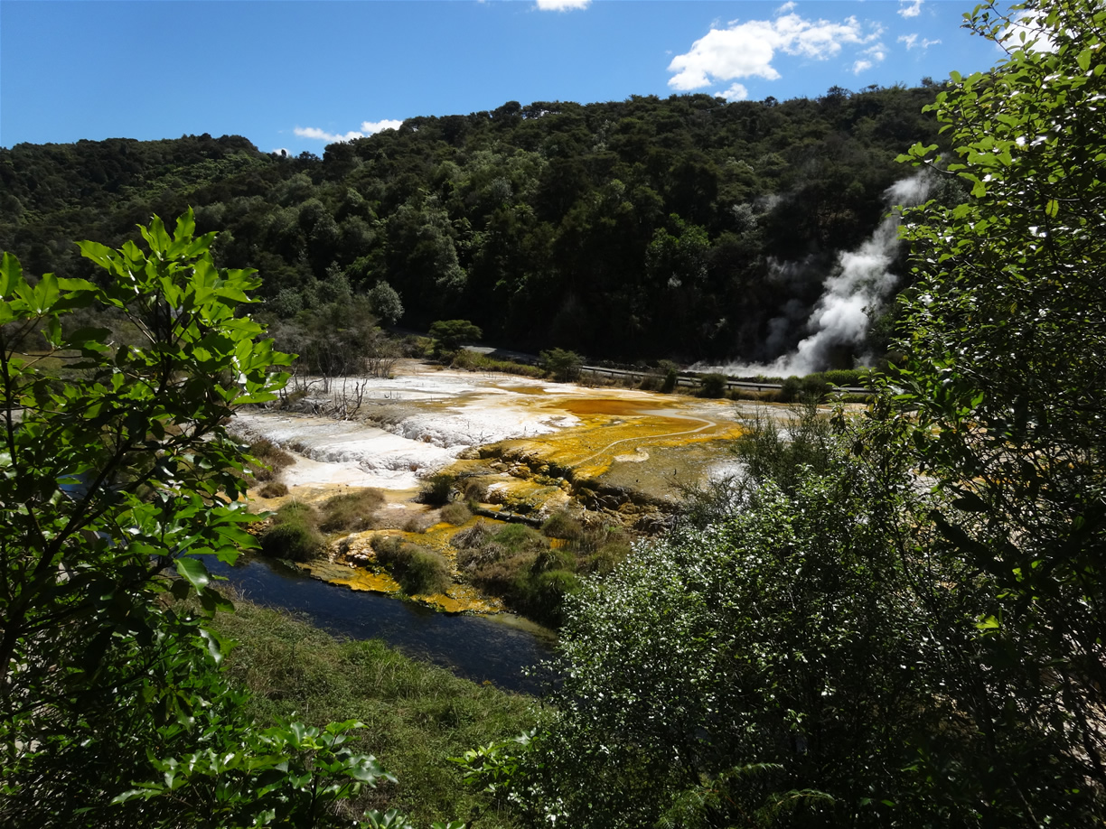 Het Noorder- en Zuidereiland zijn geologisch gezien verschillend. Bij het Noordereiland schuift de Pacificplaat onder de Australische, met als gevolg een verhoogde activiteit van vulkanisme. Er zijn veel actieve vulkanen zoals White Island in de Bay of Plenty, Rotorua, Lake Taupo en Mt Taranaki. Op het Zuidereiland schuiven de platen niet onde elkaar, maar botsen ze tegen elkaar op. Met als gevolg dat het land in de breukzone naar boven wordt gestuwd. Hoge bergen domineren dit deel van het land, met de Zuidelijke Alpen akls belangrijke noord-zuid lopende ruggengraat. De hoogste top is Mt Cook. Het Zuidereiland is met een oppervlakte van ongeveer 150.000 km2 iets groter dan het Noordereiland; het is 800 kilometer lang en op zijn breedtst ruim 300 kilometer. De Nieuw Zeelandse Alpen strekken zich over vrijwel de gehele lengte van het eiland uit, met 223 pieken hoger dan 2300 meter (hoogste is bijna 3800 meter). De oostzijde van de Alpen is droog en grotendeels onbegroeid, terwijl de westkust veel regen kent en indrukwekkende bossen, meren, bergen en gletsjers. In Christchurch, de grootste stad op het Zuidereiland, wonen nog geen 400.000 mensen. Het biedt goede internationale vluchtverbindingen. Het Noordereiland kent een reeks klimaten, van het "winterloze" noorden tot de met sneeuw bedekte bergen in het centrum van het eiland en de stevige winden van het zuiden. Van de punt van Northland tot Taranaki in het westen en Hawke's Bay in het oosten verleent de zee aan de hele kust een opvallend karakter. Hoewel het de meeste bekendheid de meeste bekendheid om de geothermische wonderen geniet, is het Noordereiland ook een vruchtbare regio met een belangrijke zuivelindustrie (onderweg kom je heel veel "melkvrachtwagens" tegen), boom- (kiwi's, perzikken etc.) en wijngaarden. De eerste Polynesische reizigers zouden zo'n 700 tot 1000 jaar geleden op de noordkust van het Noordereiland aan land zijn gekomen. Northland wordt ook wel als de bakermat van het moderne Nieuw Zeeland beschouwd. Samuel Marsden, de eerste missionaris, vestigde in 1814 in Rangihoua in Northland een anglicaanse missiepost en in 1840 werden in Waitangi het Verdrag van Waitangi getekend en Russell tot eerste hoofstad uitgeroepen voor deze naar het zuiden verschoof. Bovendien waren hier de eerste tekenen zichtbaar van de Maori-rebellie tegen de Britten. Bron tekst: Capitoolgids, de Volkskrant, Dominicus Landengids. |