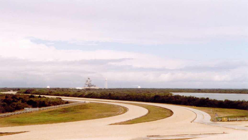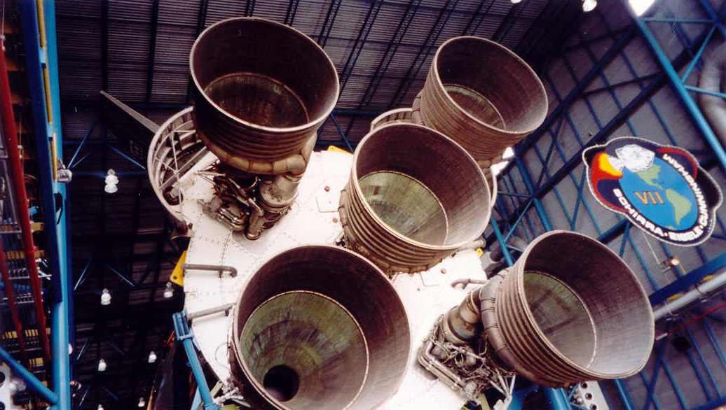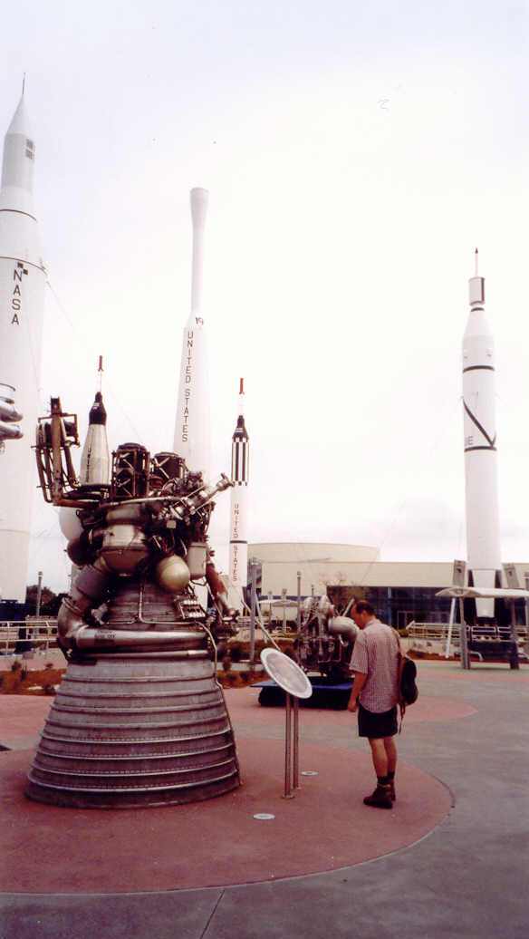 van links naar rechts: lanceerplatform 39a en 39b, motoren van de Saturnus, Rocket Garden.