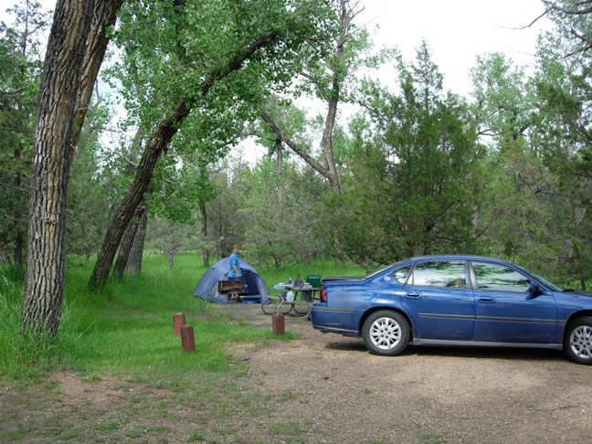 - Crazy Horse (foto rechts). - Jewel Cave NM: cave tour. - Devils Tower NM: wandelen. Belle Fourche campground in Devils Tower NM. dag 10: Devils Tower NM - Theodore Roosevelt NP (south unit) Het zuidelijke deel van Theodore Roosevelt NP ligt ongeveer 250 mijl ten noordoosten van Devils Tower NM. Vanuit Devils Tower NM hwy 24 volgen in oostelijke richting naar South Dakota. Iets ten zuiden van Belle Fourche hwy 85 oprijden, door deze plaats rijden en verder gaan in noordelijke richting. Hwy 85 blijven volgen tot in North Dakota, tot aan de I-94. De I-94 oprijden in westelijke richting tot aan de ingang van Theodore Roosevelt NP bij het plaatsje Medora. Theodore Roosevelt NP (south unit): wandelen, film in visitor center, huisje waar Theodiore Roosevelt vakanties doorbracht. Cottonwood campground in Theodore Roosevelt NP. dag 11: Theodore Roosevelt NP (south unit) Theodore Roosevelt NP (south unit): wandelen. Cottonwood campground in Theodore Roosevelt NP (foto rechts). dag 12: Theodore Roosevelt NP (south unit) - Theodore Roosevelt NP (north unit) Het noordelijk deel van Theodore Roosevelt NP ligt ongeveer 85 mijl ten noorden van het zuidelijke deel. Knife River Indian Village NHS ligt ongveer 140 mijl ten noordoosten van het zuidelijk deel van Theodore Roosevelt NP en ongeveer 130 mijl ten zuidoosten van het noordelijke deel. Via de I-94 in oostelijke richting (Bismarck) rijden en bij exit 127 hwy 31 oprijden en deze in noordelijke richting volgen. Vanuit het kleine plaatsje Stanton is Knife River Indian Village NHS via hwy 200 te bereiken. Aan de andere kant van Stanton, ook aan hwy 200, ligt Fort Clark HS. Iets verder (bij Washburn, aan de andere kant van de Missouri) ligt Fort Mandan HS en het Lewis & Clark Interpretive Center. Hwy 200 komt in westelijke richting uit op hwy 85 (in het plaatsje Killdeer is de afslag naar Killdeer Battlefield HS). Deze weg in noordelijke richting volgen tot aan het noordelijk deel van Theodore Roosevelt NP. - Fort Mandan HS. - Lewis & Clark Interpretive Center. - Fort Clark HS. - Knife River Indian Village NHS. - Killdeer Battlefield HS - Theodore Roosevelt NP (north unit): wandelen. Juniper campground in Theodore Roosevelt NP. dag 13: Theodore Roosevelt NP (north unit) - Williston Fort Union Trading Post NHS ligt ongeveer 80 mijl ten noordwesten van Theodore Roosevelt NP. Hwy 85 in noordelijke richting volgen. In Watford City maakt deze weg een scherpe bocht naar links en loopt vervolgens in westelijke richting. Na een mijl of 15 draait de weg naar rechts en loopt dan weer in noordelijke richting. Na 5 mijl hwy 200 oprijden en na ongeveer 18 mijl (vóór Fairview) via hwy 58 naar het Fort rijden.