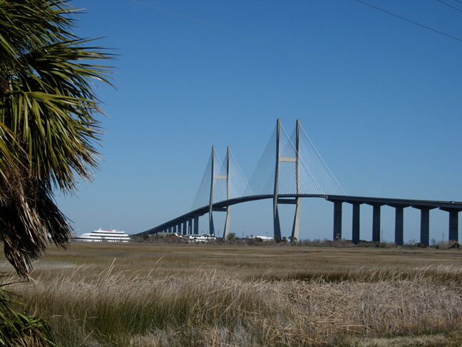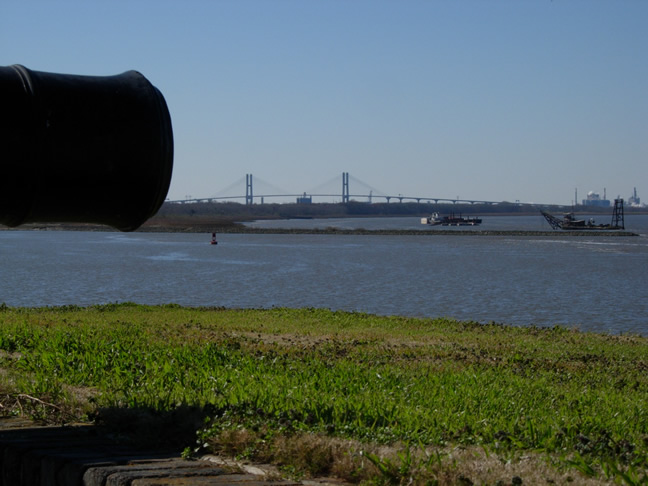 - High Falls SP, Jarrell Plantation SHS;- Piedmont NWR; - Ocmulgee NM. Comfort Inn & Suites in Statesboro. dag 3: Statesboro - Savannah Statesboro ligt ongeveer 50 mi/80 km ten noordwesten van Savannah. Foto: Talmadge Memorial Bridge (Savannah River, hwy 17) vanaf Old Fort Jackson. Om Fort Pulaski te bereiken: Vanuit Statesboro via hwy 80 naar Savannah. Op bepaald moment hwy 80 verlaten (let op borden die Pulaski NM aangeven) door recht door te rijden over Bay Street. Deze weg loopt onder de grote brug over de Savannah River door en gaat, met een afslag naar links over in President Street. Deze in oostelijke richting blijven volgen (wordt op bepaald moment weer hwy 80). Even voor Tybee Island ligt het fort. Old Jackson Ford ligt aan President Street en is te bereiken door vanuit Fort Pulaski dezelfde weg terug te rijden. - Fort Pulaski NM; - Old Fort Jackson; - Savannah. Best Western/Ruby Tuesday bij exit 94 van de I-95 ten zuiden van Savannah. Rond exit 94 heeft zich een klein dorp van motels en eetgelegenheden gevestigd, dus er is veel keuze. dag 4: Savannah - Brunswick Brunswick ligt ongeveer 60 mi/96 km ten noordwesten van exit 94 van I-95. Volg I-95 in zuidelijke richting. De verschillende bezienswaardigheden staan goed aangegeven bij de afslagen. Vanuit Fort King George SHS is het mogelijk om Fort Frederica NM te bereiken via hwy 17; terugrijden naar I-95 is dus niet nodig. Let op: De parken die door de staat Georgia worden beheerd, zijn niet alle dagen van de week geopend (2010). Helaas moesten wij vaststellen dat de informatie op de website niet altijd up to date is. Wij reden na ons bezoek aan Fort King George SHS naar Hofwyl-Broadfield Plantation SHS maar die bleek, i.t.t. wat de website aangaf, niet geopend op woensdag. ![]()