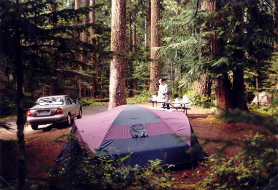 dag 4: Olympic NP Olympic NP: Lake Cresent, Storm King Information Station - Marymere Falls Trail, Sol Duc Falls Trail. Heart of the Hills campground in Olympic NP (zie foto). dag 5: Olympic NP Bogachiel SP ligt ongeveer 100 km ten zuidwesten van Port Angeles. Olympic NP: Ozette - Cape Alava Trail. Camping in Bogachiel SP. dag 6: Olympic NP Olympic NP: Hoh Rain Forest Visitor Center - Hall of Mosses Trail, Spruce Nature Trail. Camping in Bogachiel SP. ![]() dag 7: Olympic NP - Olympic NF Willaby campground ligt ongeveer 65 mijl ten zuidoosten van Bogachiel SP. - Olympic NP: La Push, Ruby Beach. - Olympic NF. Willaby campground in Olympic Forest (zie foto). dag 8: Olympic NF - J.M. Honeyman Memorial SP J.M. Honeyman Memorial SP ligt in Oregon, ongeveer 315 mi (kustweg) ten zuiden van Olympivc NF. - Kust van Oregon. - J.M. Honeyman Memorial SP. - Oregon Dunes NRA. Camping in J.M. Honeyman Memorial SP. dag 9: J.M. Honeyman Memorial SP - Florence - Oregon Dunes NRA. - Sea Lion Caves. Het regende enorm deze dagen. In onze tent stond na 1 nacht een flinke laag water. We lieten de tent staan en hebben in een motel overnacht, zodat wij zelf en onze spullen konden opdrogen. De tent hebben we de volgende dag opgehaald. dag 10: Florence - Siskiyou NF Oregon Caves NM ligt ongeveer 240 mi ten zuidoosten van J.M. Honeyman Memorial SP