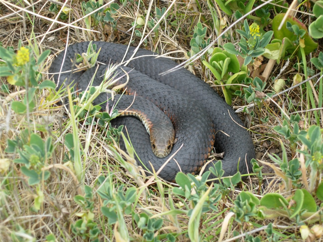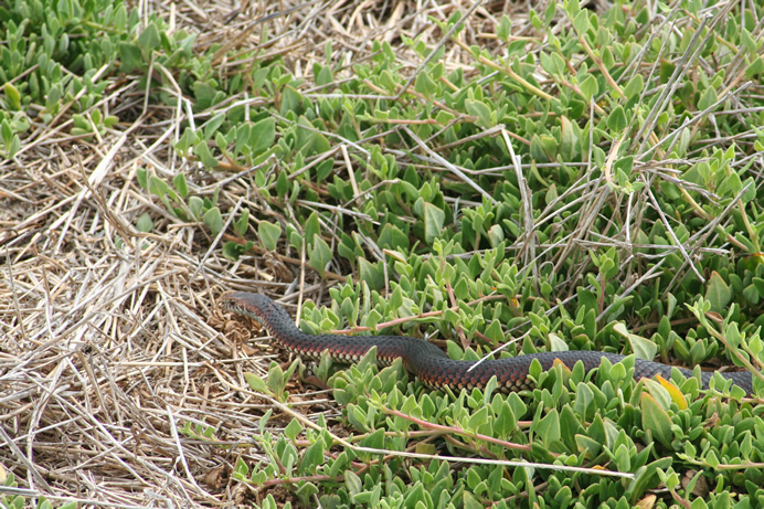 De lowland copperhead is een zeer giftige slang die voorkomt in de gematigde gebieden in zuid en oost Australië. Deze slang heeft een voorkeur voor wetlands en moeras-gebieden en kunnen daar in grote aantallen voorkomen als de omstandig-heden gunstig zijn. Een groot deel van het dieet bestaat uit kikkers en kikkervisjes maar deze slang eet eigenlijk alles als het de geschikte omvang heeft (zelfs de eigen jongen). Hij kan zeer goed zwemmen.foto's: The Nobbies (links), Port Campball NP (rechts). De lengte van deze slang is gemiddeld 1.2 tot 1.8 meter. De kleur varieert zeer sterk per dier maar ze hebben allemaal een koperkleurige kop waar ze naar vernoemd zijn (het is alleen niet altijd even duidelijk zichtbaar). De Australian Copperhead is overdag actief maar als het erg warm is gaat hij ’s nachts op jacht. Het geen agressieve slang, maar mocht hij een mens bijten dan is behandeling wel noodzakelijk, want het gif kan dodelijk zijn. De tanden zijn relatief kort dus stevige schoenen kunnen bescherming bieden. Het is nog niet zo heel lang bekend dat het geslacht Austrelaps uit 3 soorten bestaat: Lowlands Copperhead (Austrelaps superbus), Highlands Copperhead (Austrelaps ramsayi) en Pygmy Copperhead (Austrelaps labialis). Dit geslacht behoort tot de Elapidae familie; een groep van slangen met een sterk ontwikkeld orgaan dat in staat is de kleinste veranderingen van temperatuur waar te nemen. Verder hebben slangen uit deze familie onbeweeglijke giftanden aan de voorkant van de kaak. |